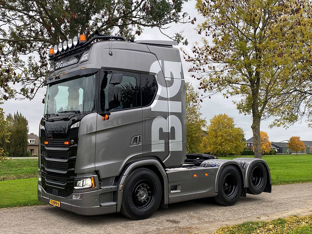 Big Machinery heeft de truck een fraai design gegeven. Hij ziet er in zijn grijs metallic met hoogglans zwart gewoon enorm chique uit. Het hele BIG Team vindt de Scania ook uiterst geslaagd. “Hij is écht af zonder over de top te zijn. Het meeste spuitwerk is al door Scania af fabriek gedaan. Alleen kleine details als de toplampen en zo meer hebben we zelf laten spuiten.”