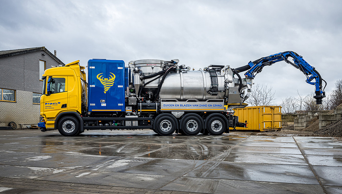 URMOND - Pepels uit Urmond heeft onlangs een bijzondere Scania R500 8x4 XT met een ruime R17 dagcabine met een hoog dak in gebruik genomen. Op het verzwaarde bakwagenchassis staat een Cappellotto vacuüm zuig/blaas installatie waarmee Pepels in staat is, niet alleen grond, zand en grind, maar ook water op te zuigen. Ook kan er met deze installatie stoffen als zand en grind teruggeblazen worden. Bijzonder is ook dat het voertuig zelfrijdend is en radiografisch op afstand bestuurd kan worden.