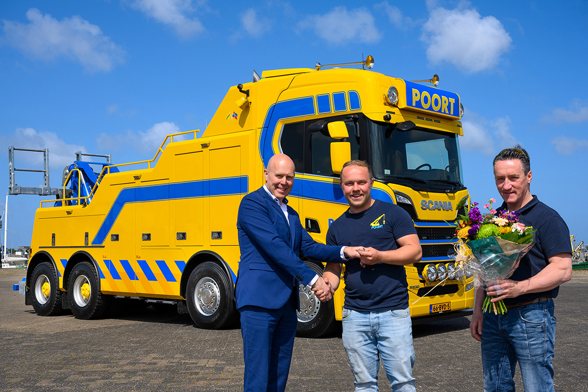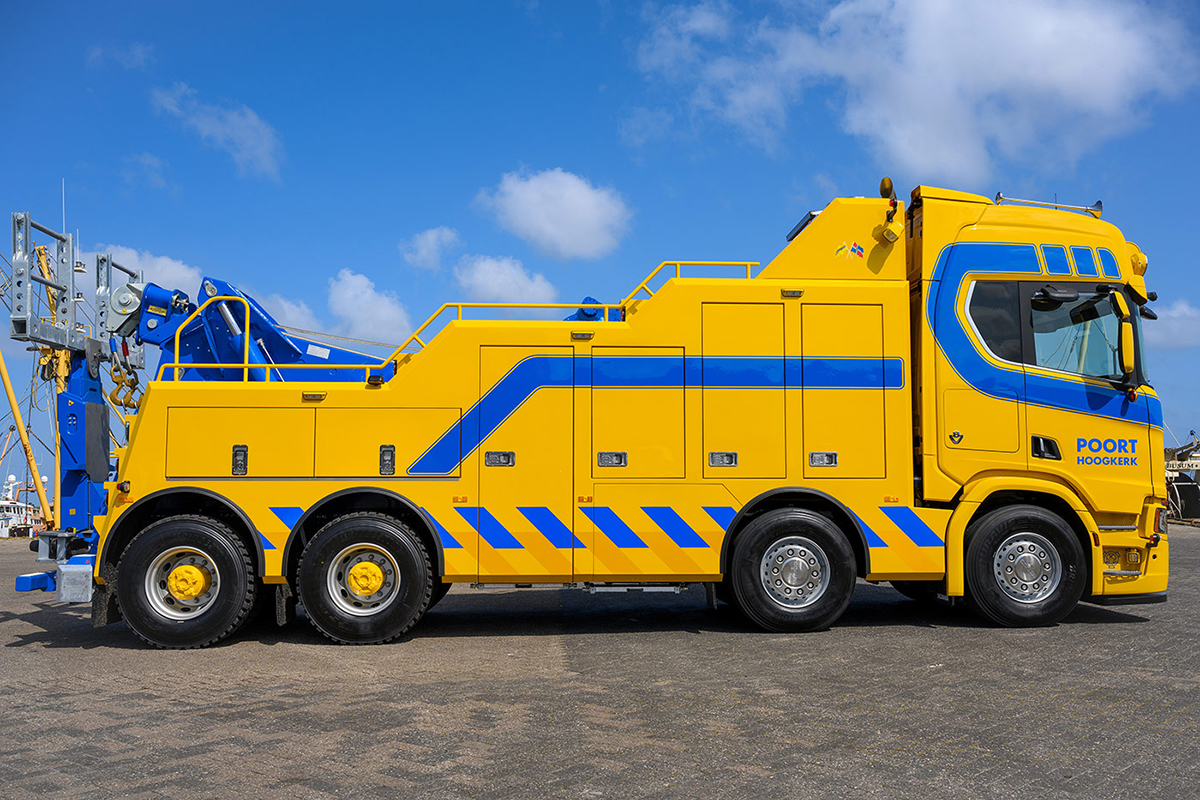 HOOGKERK - Takel- en bergingsbedrijf Poort uit Hoogkerk (Groningen) nam recent een nieuwe zware Scania R530 8x4 als zwaar bergingsvoertuig in gebruik. Dankzij de uiterste efficiënte opbouw is het voertuig in staat iedere bus en elk merk truck zonder bijkomende schade te bergen. “En daar gaat het uiteindelijk om”, aldus Hendrik Poort