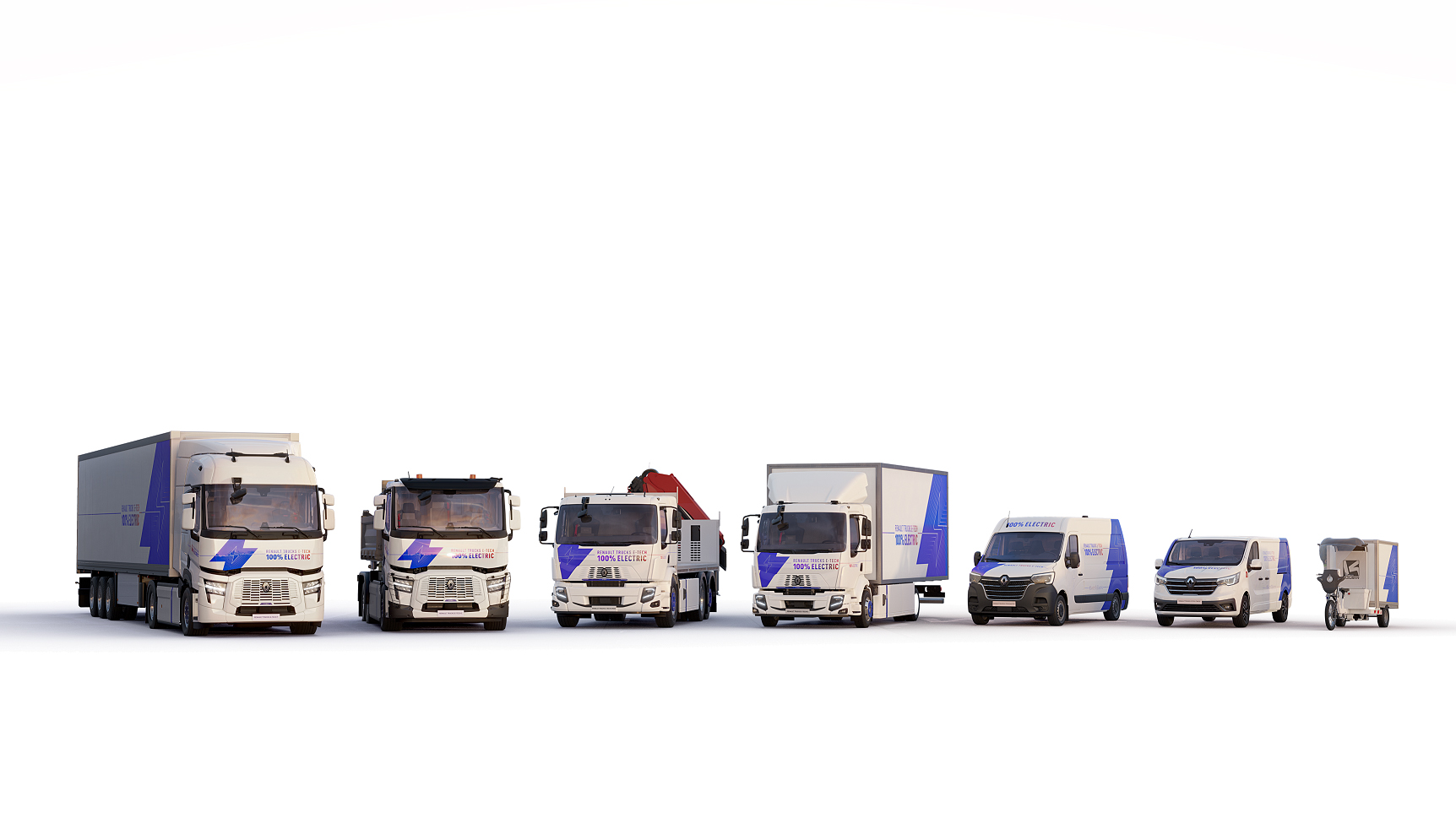 Ook de elektrische versies, de Renault Trucks E-Tech D, D Wide & D Wide LEC, zijn visueel onderscheidend dankzij een volledig gespoten voorkant, inclusief de grille. De grille is ook verfraaid met een subtiele "E-Tech" batching die zijn grafische vormgeving benadrukt. Alle voertuigen dragen daarnaastvmet trots het nieuwe Renault Trucks logo.