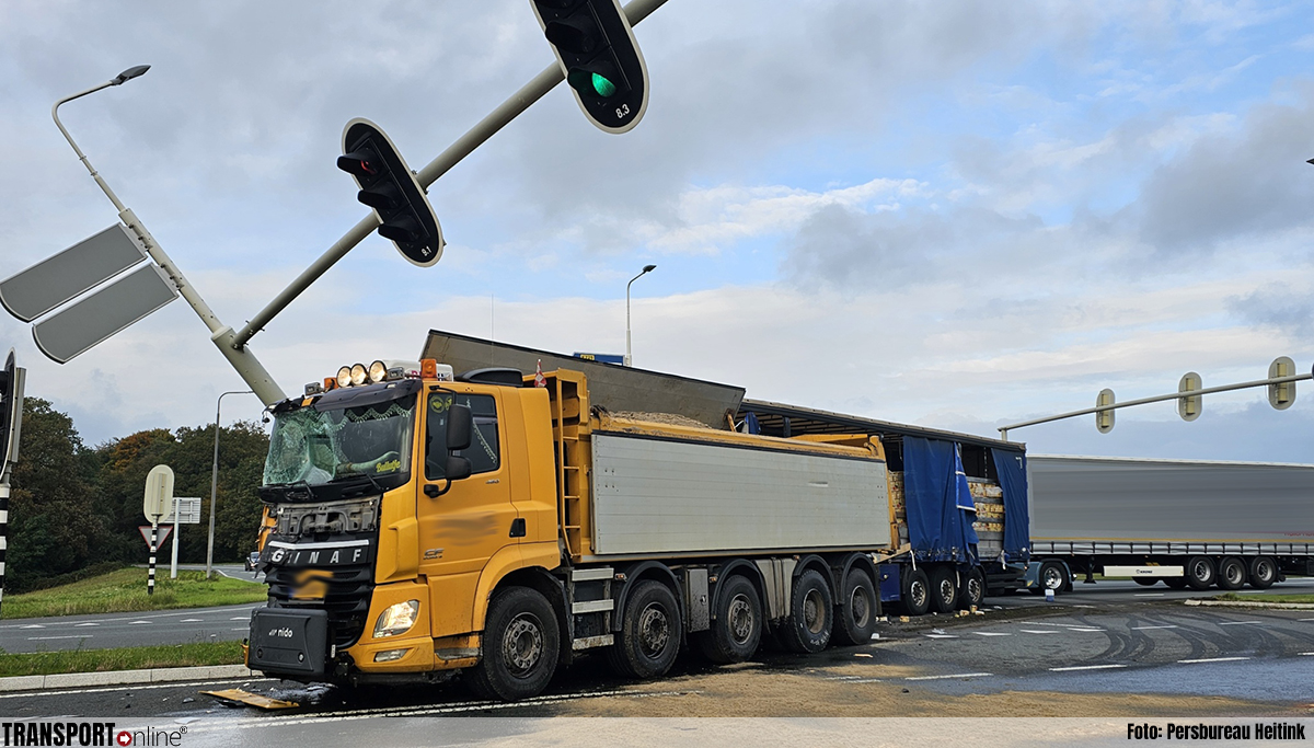 HEELSUM - Forse schade bij een aanrijding tussen twee vrachtwagens in Heelsum. Eén van de vrachtwagens reed een verkeerslicht omver.