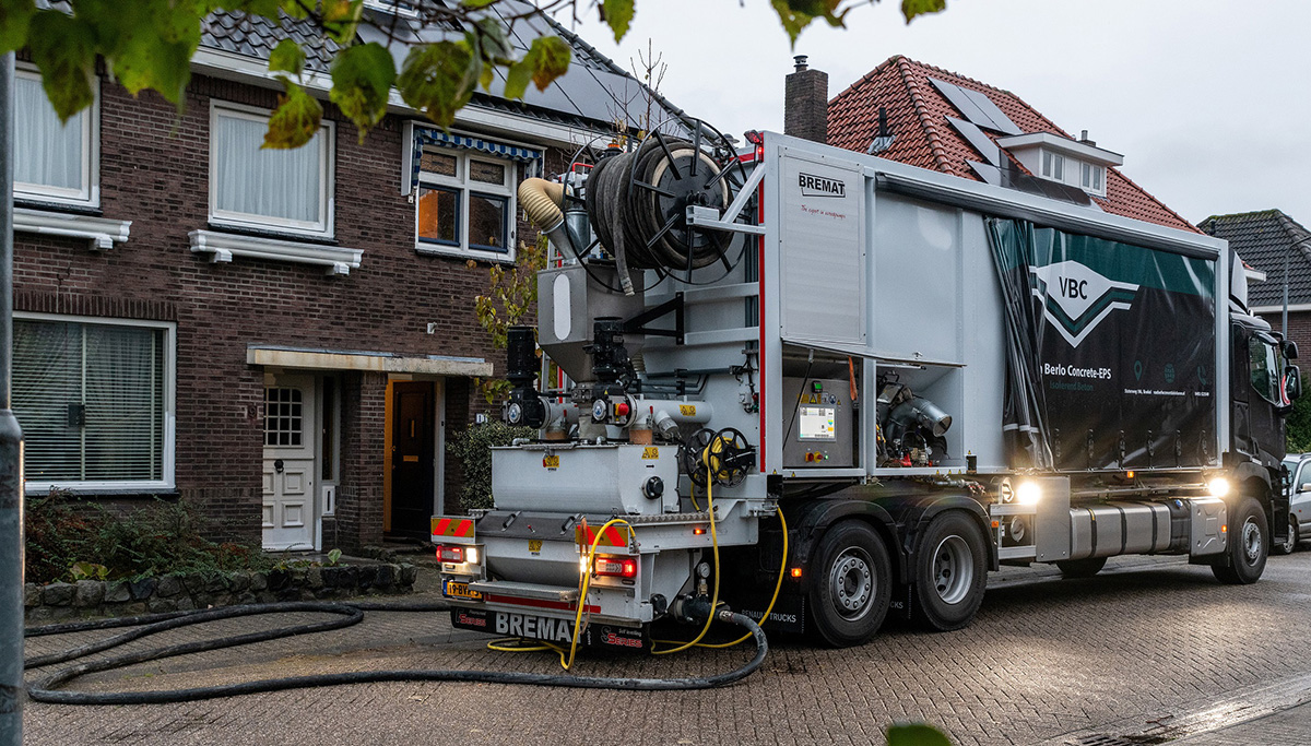 Van Berlo: “Hiermee kunnen we Concrete-EPS storten. Dat is een isolerende ondervloer, waar vervolgens vloerverwarming en een cementdekvloer op komen. Voorheen stortten we alleen de cementdekvloer, nu kunnen we onze opdrachtgevers een compleet pakket bieden. Voor de klant is het makkelijker als hij één aanspreekpunt heeft voor de ondervloer, vloerverwarming en de cementdekvloer. Bovendien kunnen we alle werkzaamheden optimaal op elkaar afstemmen om de doorlooptijd zo kort mogelijk te houden. Dat levert in de praktijk tot wel 35 procent tijdwinst op.”