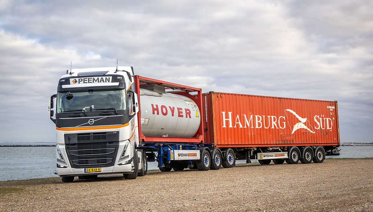Peeman Transport uit Dirksland doet voornamelijk zeecontainer- en tanktransport in en vanuit de havens in Rotterdam en Antwerpen. In zijn ambitie om transport lean and mean uit te voeren heeft het bedrijf meerdere bijzondere configuraties in de vloot. Een daarvan is een LZV-combinatie die bestaat uit een trekker, een drie-assige B-Double oplegger met drie-assige D-Tec trailer daarachter. “Met deze combinaties kunnen we voorop een 20 óf 30 foot container meenemen, en achterop 40, 30 of 2x20 foot”, zegt eigenaar Jan Peeman.