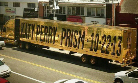 LOS ANGELES - De Amerikaanse zangeres Katy Perry lanceert in oktober van dit jaar een nieuw album genaamd 'Prism'. Om haar nieuwe album te promoten zet zij een gigantische goudkleurige, Amerikaanse truck in. De goudkleurige truck zal zich door de heel Amerika begeven maar is tot nu toe alleen nog gespot in Los Angeles.