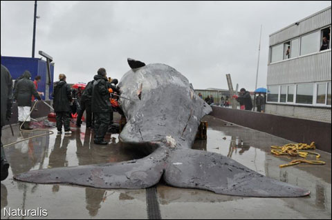 Het dier strandde maandagmiddag op het Terschelling en bezweek enkele uren later. Dinsdagochtend werd het dier naar de haven van Harlingen versleept. Het bergingsbedrijf kon pas na vele uren het beest op het droge te krijgen.