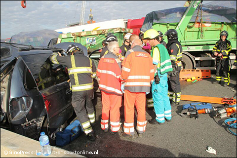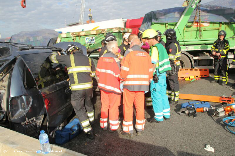 Een vrachtagen met bouwcontainers is in aanrijding gekomen met een personenauto. Van laatstgenoemde is niet veel meer over. De brandweer probeert beknelde inzittenden te bevrijden.