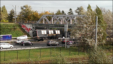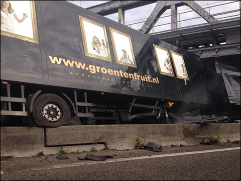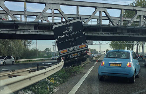 De vrachtwagen staat instabiel midden op de betonnen barrier. Daardoor bestaat de kans dat hij omvalt. Omdat de vrachtwagen precies onder een viaduct staat, kan de vrachtwagen niet getakeld worden. Wegslepen levert ook gevaar op.