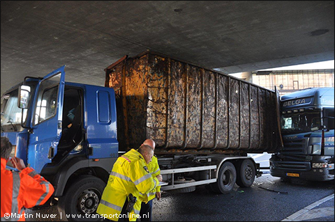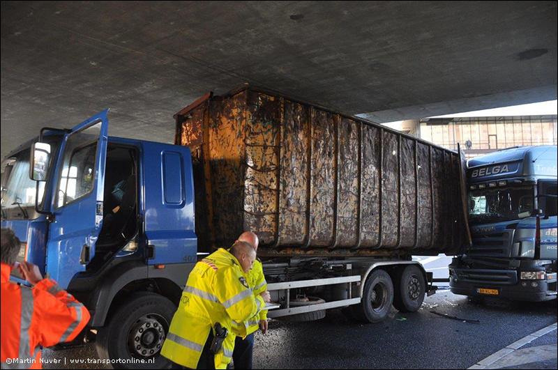 Vrachtwagen vast onder viaduct aangereden door vrachtwagen