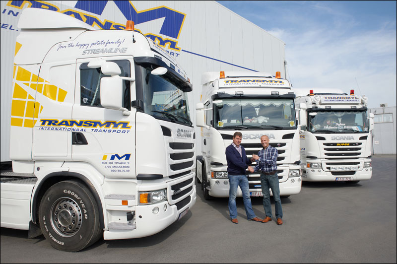 Transmyl vervoert aardappelen, afgewerkte aardappelproducten en zeecontainers. Onder impuls van Bruno Mylle, breidde Transmyl recent zijn vloot uit met vier nieuwe Scania’s van het type G440 LA4x2HSA met de zuinige 13 liter Euro 5 motor met 440 pk en 2300 Nm koppel, een CG19 Highline cabine en een manuele GR905 versnellingsbak. Met deze wagens gaat de vlootgrootte van Transmyl richting de dertig stuks.