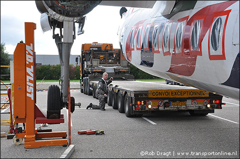 Met behulp van twee mobiele hefinrichtingen, die normaal in werkplaatsen worden gebruikt om een vrachtwagen op te tillen voor reparatie en onderhoud, werd de Fokker onder de wielen van het landingsgestel opgetild, waarna de dieplader, 8 aslijnen van Nooteboom trailers, er onder kon worden gereden.