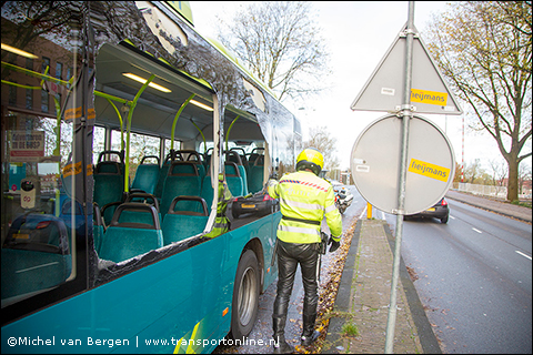 De bus is even verderop op de Oudeweg stilgezet. Een motoragent heeft het veiligheidsglas van beide ramen compleet ingetikt zodat er onderweg geen glas uit zou vallen. De bus is vervolgens naar het terrein op de Waarderpolder doorgereden.