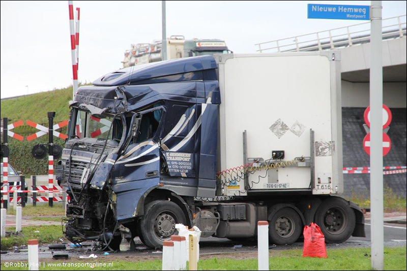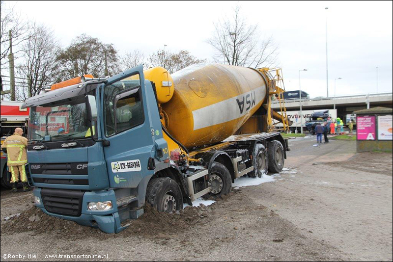 AMSTERDAM - Op de Nieuwe Hemweg in Amsterdam heeft dinsdagochtend rond 10:30 uur een aanrijding plaatsgevonden tussen een vrachtwagen en een cementwagen. Eén van de chauffeurs kwam bekneld te zitten in zijn cabine.