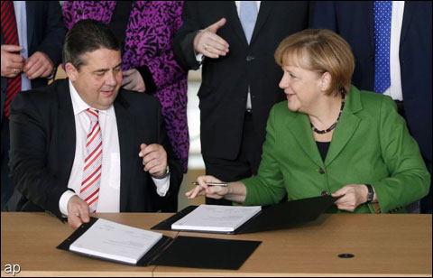 De komst van de brede coalitie, große Koalition in het Duits (of afgekort, GroKo), is overigens nog niet definitief. De achterban van de SPD moet zich in december nog uitspreken over het akkoord. Een fors deel van de zo'n 470 duizend leden staat uiterst sceptisch tegenover samenwerking met Merkel.
