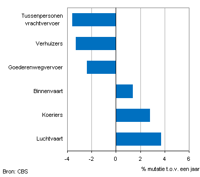 De omzet van de binnenvaart steeg met ruim 1 procent na zes kwartalen van omzetdalingen. Luchtvaartbedrijven noteerden een omzetstijging van bijna 4 procent. Deze toename kwam volledig op het conto van het passagiersvervoer. De omzet van de luchtvracht daalde. Door de online verkopen en gestegen tarieven steeg de omzet van de pakketbezorgers voor het derde jaar op rij.