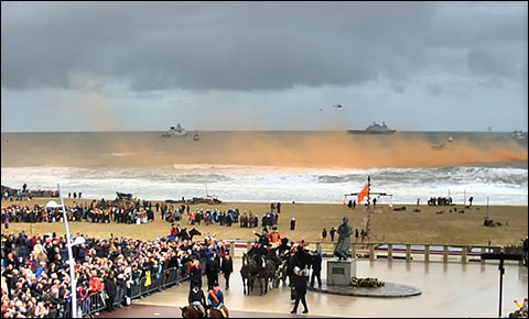 Het aanvankelijke plan was de 'prins' te laten landen met een sloep, zoals tweehonderd jaar geleden ook gebeurde. Door de hoge golven werd dat niet veilig geacht en daarom werd de prins door de branding gevoerd met een zogeheten Beach Armoured Recovery Vehicle (BARV). Figuranten droegen hem en zijn gevolg vervolgens naar een gereedstaande koets.