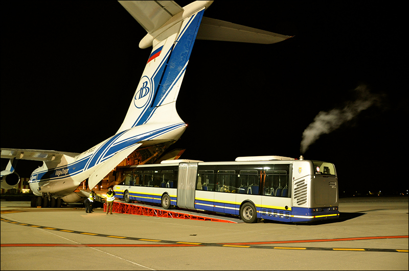De ultieme halte voor een 18 meter lange bus was recentelijk een vrachtvliegtuig van Volga-Dnepr. De harmonica-bus moest van Turijn, Italië, naar Astana in Kazachstan vervoerd worden.