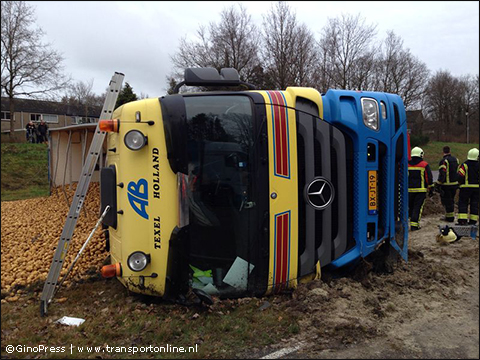 EMMEN - Dinsdagmiddag 17 december rond 14:00 uur is er een vrachtwagen met 30 ton aardappelen gekanteld op de Rondweg in Emmen.