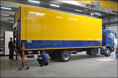De serie van vijf is modulair gebouwd, wat veel tijd scheelt, volgens Van Stenis. "Tot en met de laadklep hebben we de bakken al gereed. Dus wanneer de klant komt met zijn chassis, hoeft het niet meer dan een dag te duren en de bak staat er compleet gemonteerd op. Dat is het grootste voordeel van dit systeem."