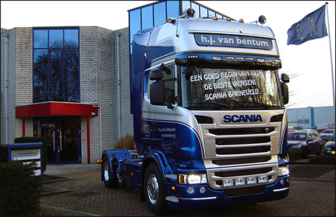 BARNEVELD - Bij H.J. van Bentum bv in Woudenberg zijn maar liefst twintig nieuwe Scania trekkers in gebruik genomen. Het betreffen zowel Topline als Highline cabines, variërend van 440 tot 480 pk. De nieuwe voertuigen zullen voornamelijk gaan rijden richting Engeland met bulkgoederen. De Scania vestiging in Barneveld leverde de voertuigen af.