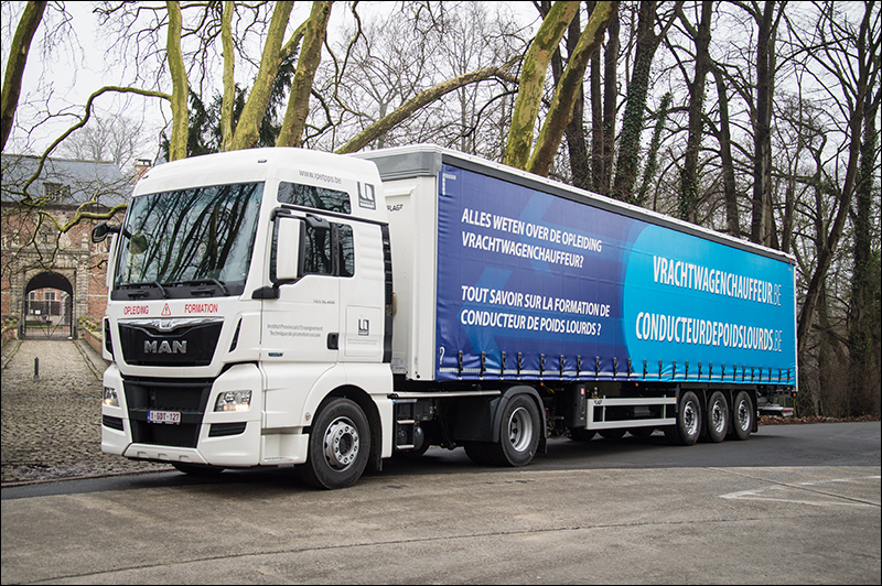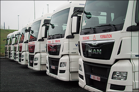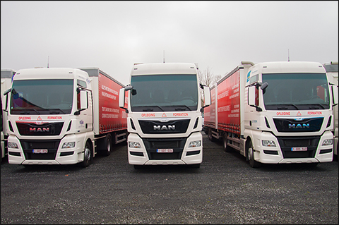 JOURE - Sociaal Fonds Transport en Logistiek, een overlegorgaan tussen werknemers en werkgevers dat in België onder andere chauffeursopleidingen verzorgt, heeft op 27 januari 29 nieuwe MAN vrachtwagens in gebruik genomen. Deze Euro 6 MAN TGX 18.400 zijn omgebouwd tot lesvoertuigen door Wierda Voertuig Techniek.