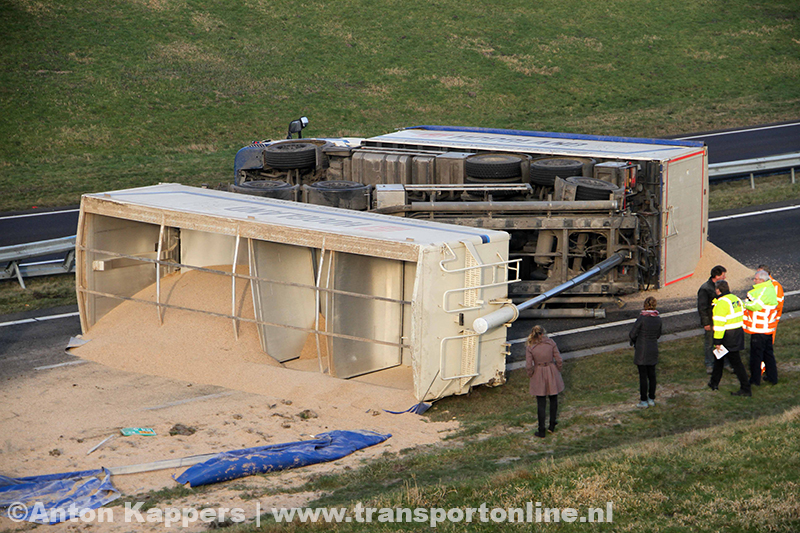 De combinatie raakte ter hoogte van het aquaduct tussen Leeuwarden en Garyp in de slip waarna hij kantelde. Nadat hij een stuk over de weg was doorgeschoven kwam hij tegen de middengeleider tot stilstand. Voor zover bekend is de chauffeur ongedeerd gebleven. De inhoud van de trailer licht bezaaid over de weg.