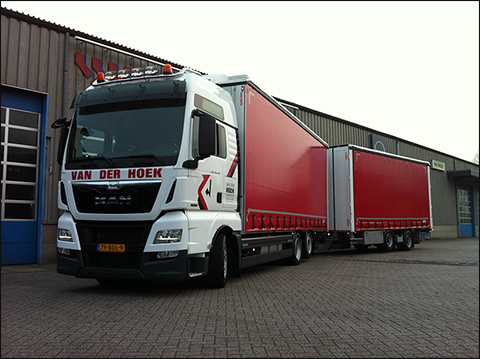 JOURE - Afgelopen weekend heeft Tjisse van der Hoek uit Joure zijn nieuwe combinatie in gebruik genomen. Het MAN TGX 26. 440 6x2-2 LL chassis en de Wecon opbouw zijn een uitermate doordacht concept. Er is met alles rekening gehouden. Laadlengtes en hoogtes zijn allemaal exact afgestemd op de wettelijke maten en de te vervoeren pallets/boxen. Van der Hoek heeft zijn jaren lange ervaring allemaal weten te stoppen in deze volume combi. Met onder andere kleine banden, een uitgekiende aandrijflijn, luchtvering op alle assen en een hefbare naloopas is ervoor gezorgd dat deze combi aan alle eisen van van der Hoek voldoet.
