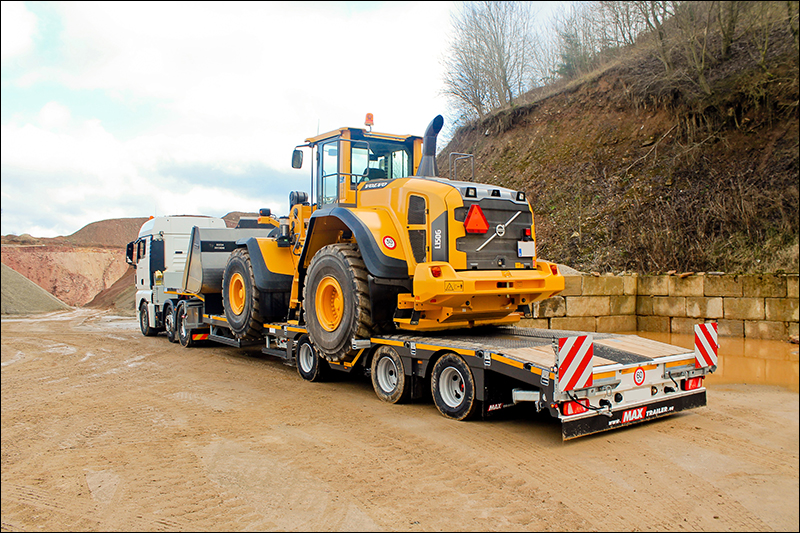 Vol trots presenteert Hertoghs Carrosserieën de nieuwe Maxtrailer MAX100 met wielkuilen ten behoeve van het transport van hoge grondverzetmachines.
