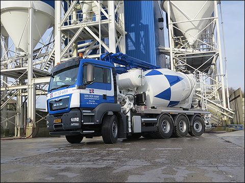 De nieuwe betonpompmixer is geleverd door Roordink Bedrijfswagens, vestiging Barneveld. Ook heeft Van der Kamp een MAN TGX 4x2 Euro 6 aangeschaft voor het trekken van betonmixertrailers met 13 kuub laadvermogen. "Het hoge laadvermogen van de MAN is te danken aan de korte afstand tussen de drie achterassen, waarvan de laatste meesturend is", aldus Gerard Lindeboom, Transportleider bij Van der Kamp. "Met een betontrommel van 7 kuub, waarin we 6,5 kuub beton kunnen meenemen, blijven we binnen de wettelijk toegestane aslasten en hebben we geen problemen met weeglussen in de snelwegen."