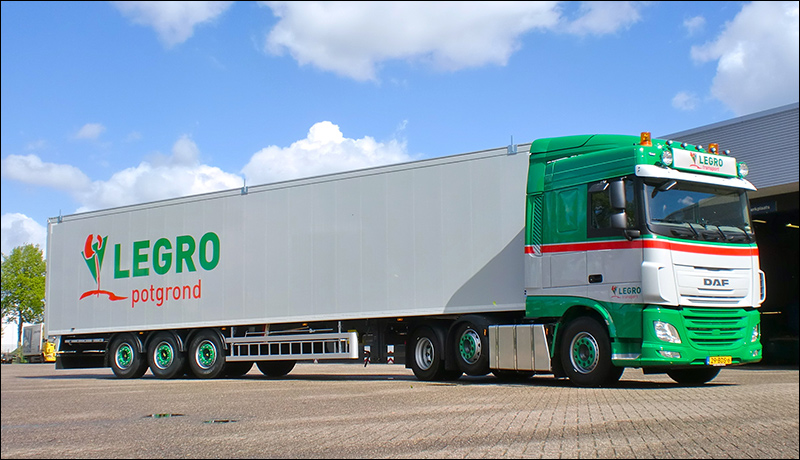 De werk- en leefruimte is ongeëvenaard en biedt de chauffeur alle comfort: een royale koelkast, ruim 675 liter opbergruimte, luchtgeveerde chauffeursstoel, airconditioning en de DAF Driver Performance Assistant (DPA) die de chauffeur ondersteunt met ritgegevens. De schuifvloertrailer is geleverd door Knapen Trailers in Deurne. De nieuwe DAF is aangeschaft door Legro Transport en wordt met name ingezet voor het transport van substraten naar Engeland.