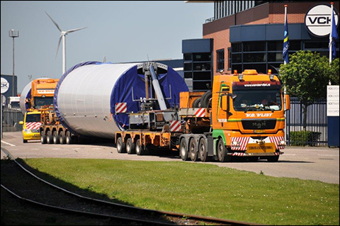 De VCK in de Amsterdamse Westhaven is een van de havens waar regelmatig windmolendelen per schip worden aangevoerd. Na het lossen worden de delen overgeladen waarna deze onderdelen per speciaal transport hun weg vervolgen.