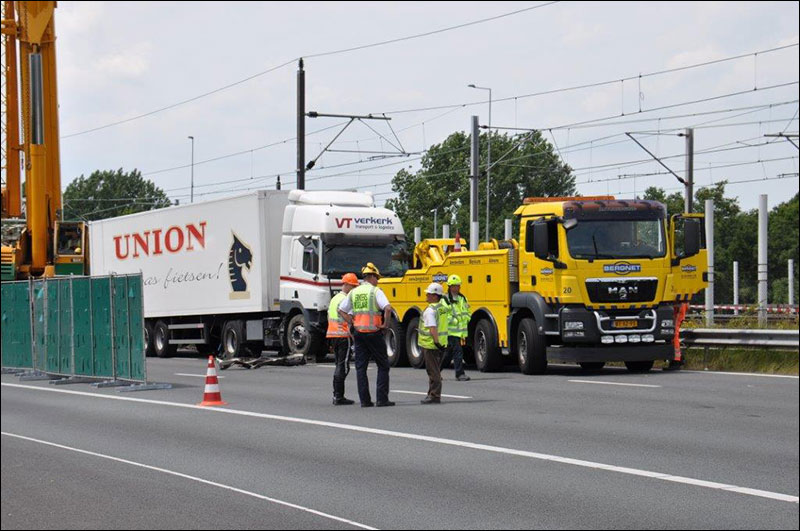 Vervolgens is de combinatie op de weg geplaatst waarna deze door een 4-assige bergingswagen van de firma Bergnet is afgesleept.