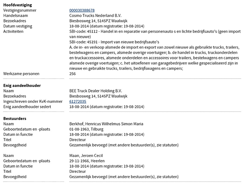 WAALWIJK - BEE Trucks Holding, onderdeel van de Van Mossel Groep, is eigenaar van Cosmo Trucks Nederland BV. Dat valt op te maken uit Kamer van Koophandel stukken.